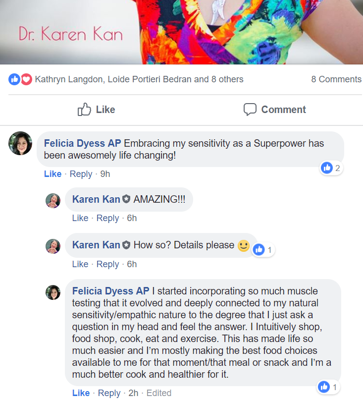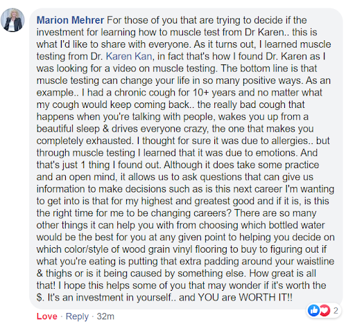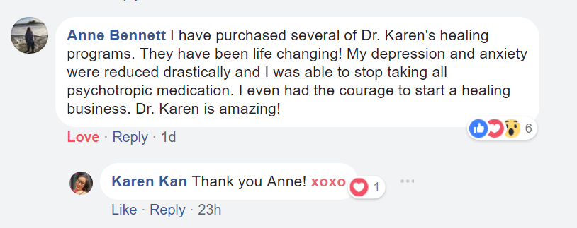 “When I experience a challenging moment, I can now seek the answers within, and, what’s amazing is Dr. Karen has equiped me with the right questions to ask so I can receive the answers I need.”