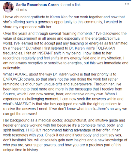 “As a psychic and medium, I've had many years of experience dealing with all sorts of negative entities attached to or affecting my clients. I've also known many energy healers. After meeting Dr. Karen, it was clear her Source-directed healing is extremely powerful. In fact, I told her her vibration was so high, it was impossible for an entity to attach to her. There aren't too many healers I've met I can say that about. Her program is extremely high vibrational and really works.”